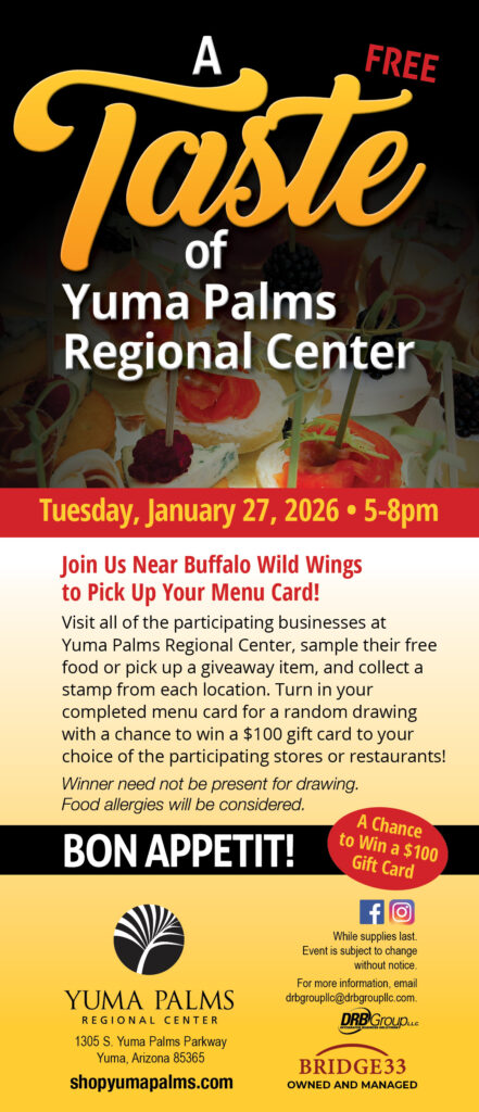 Visit all of the participating businesses in Yuma Palms Regional Center, sample their free food or pick up a giveaway item, and collect a stamp from each location. Turn in your completed menu card for a random drawing to win a $100 gift card to your choice of the participating stores or restaurants!