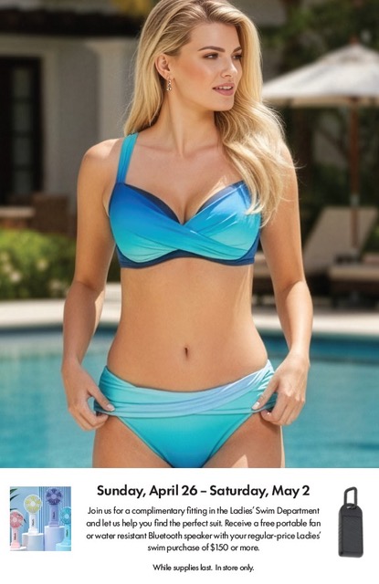 Join Dillard’s for a complimentary fitting in the Ladies’ Swim Department and let them help you find the perfect suit. Receive a free portable fan or water resistant Bluetooth speaker with your regular-price Ladies’ swim purchase of $150 or more.