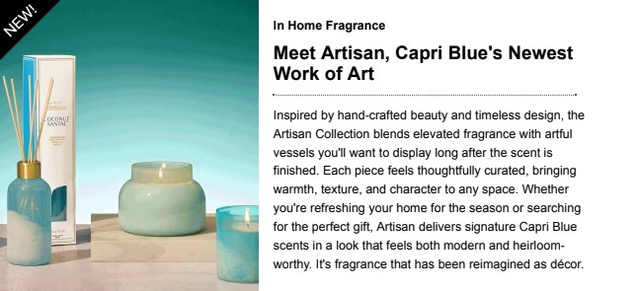 Inspired by hand-crafted beauty and timeless design, the Artisan Collection blends elevated fragrance with artful vessels you’ll want to display long after the scent is finished. Each piece feels thoughtfully curated, bringing warmth, texture, and character to any space. Whether you’re refreshing your home for the season or searching for the perfect gift, Artisan delivers signature Capri Blue scents in a look that fees both modern and heirloom-worthy. It’s fragrance that has been reimagined as décor.